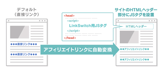 リンクスイッチは、バリューコマースから提供されるコードを今運営しているブログのヘッダーに張り付ければ、掲載されている商品販売ページのリンクを全て自動でアフィリエイトリンクに変更してくれます。