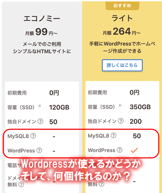 それよりも安いエコノミープランもありますが、1番安いエコノミープランですとWordpressブログが運営できません!